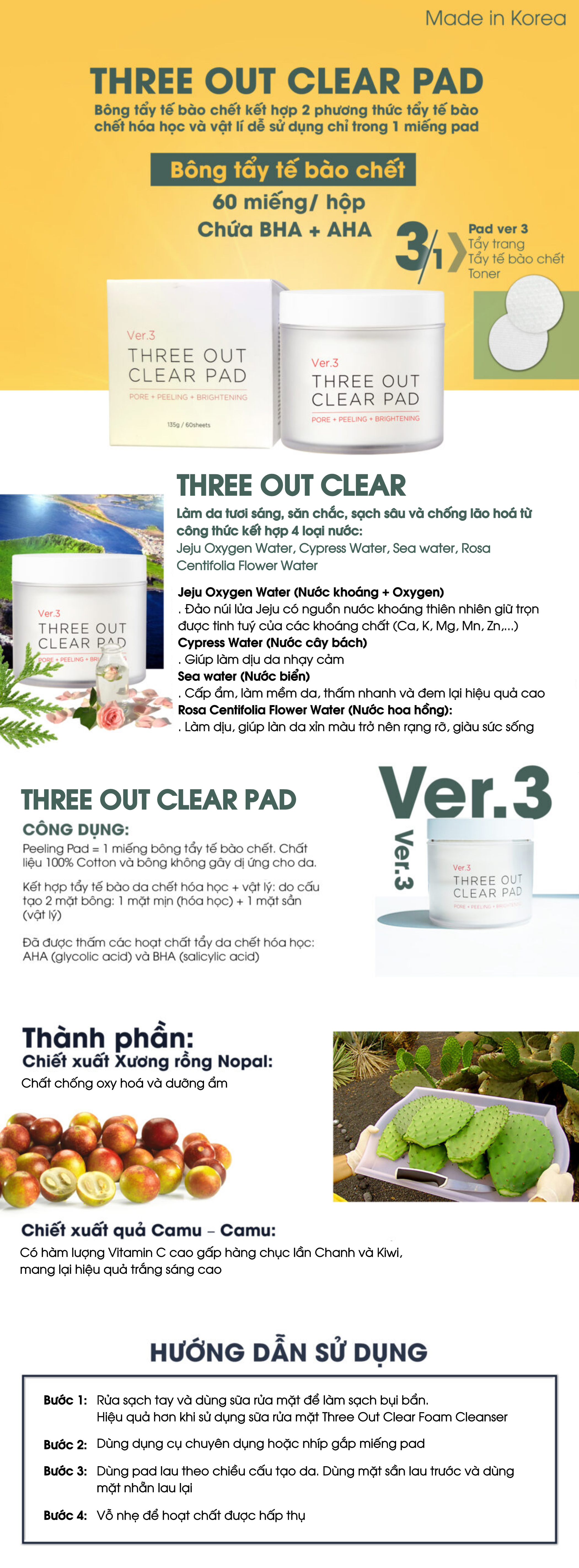 GoodnDoc Three Out Clear Pad Ver.3 là miếng tẩy tế bào chết giúp ngăn ngừa lỗ chân lông bị bí tắc, kiểm soát bã nhờn và ngăn ngừa mụn, các dưỡng chất từ chiết xuất 14 loại thực vật và thành phần cấp ẩm Vitamin B5, Sodium Hyaluronate: làm mềm và dịu làn da bị kích ứng.