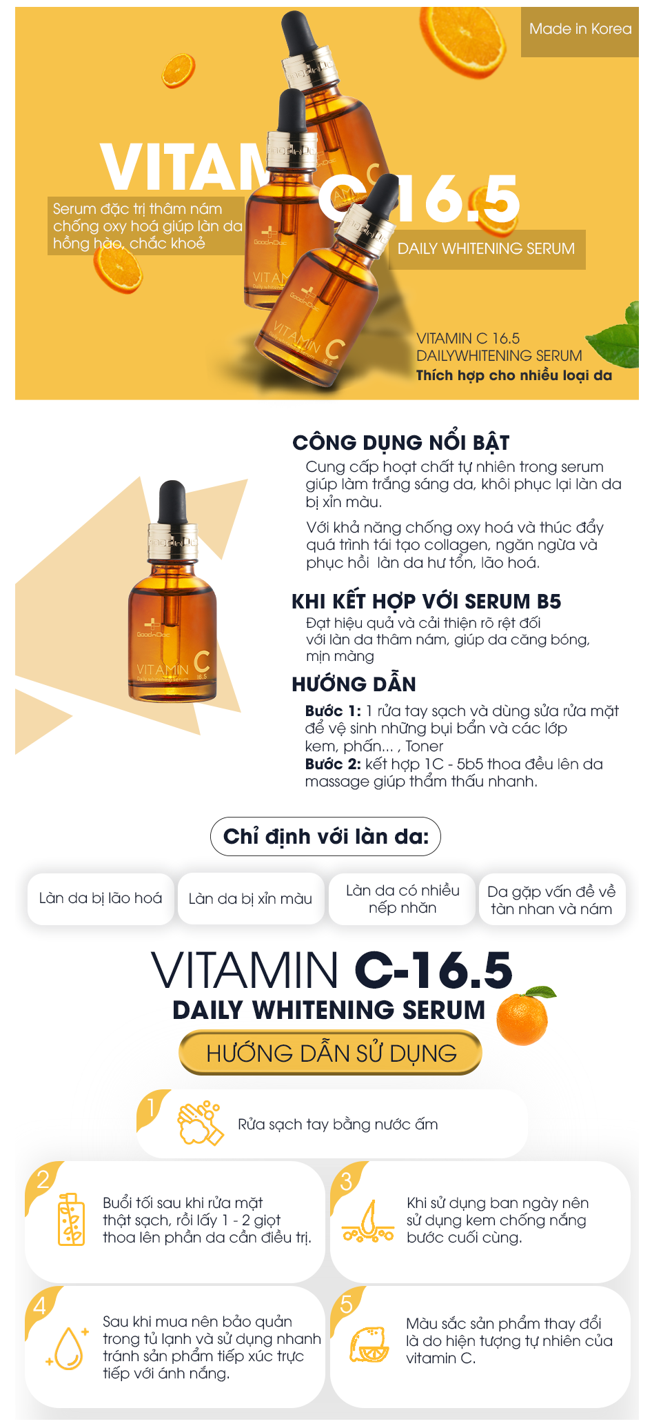 GoodnDoc Vitamin C 16.5 Daily Whitening Serum Kết hợp các thành phần nổi bật như L-asorbic acid (LAA), Niacinamide, hỗn hợp chiết xuất có chứa Vitamin E,… có công dụng Làm sáng da, mờ thâm; ngăn ngừa lão hóa; tăng sinh collagen; chống oxy hóa giúp da căng bóng.